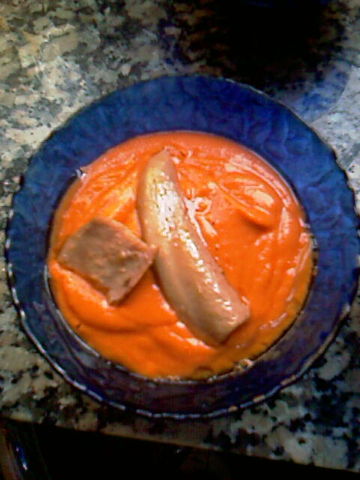 UNA SOPA FRIA MUY PARECIDA AL SALMOREJO CORDOBES. LA PORRA ANTEQUERANA LLEVA PIMIENTO. EN LA TERMINACION EN VEZ DE HUEVO DURO Y JAMON PICADITO HE PUESTO UNAS VENTRESCAS DE ATUN.